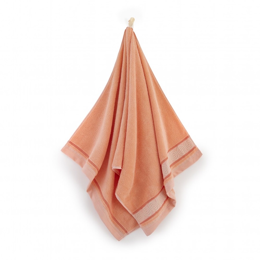 Ręcznik Rondo 2 to optymalny ręcznik, o uniwersalnym zastosowaniu, o bardzo dobrych parametrach: gramatura, chłonność i miękkość oraz odporność na odbarwienie- wszystko to jest wynikiem zastosowania bawełny egipskiej, nowoczesnej technologii ultrasoft, bardzo dobrej jakości barwników oraz najnowocześniejszego w Europie parku maszynowego obsługiwanego przez wspaniałą załogę. Specyficzna bordiura w kształcie współśrodkowych okręgów nadaje charakter temu ręcznikowi.